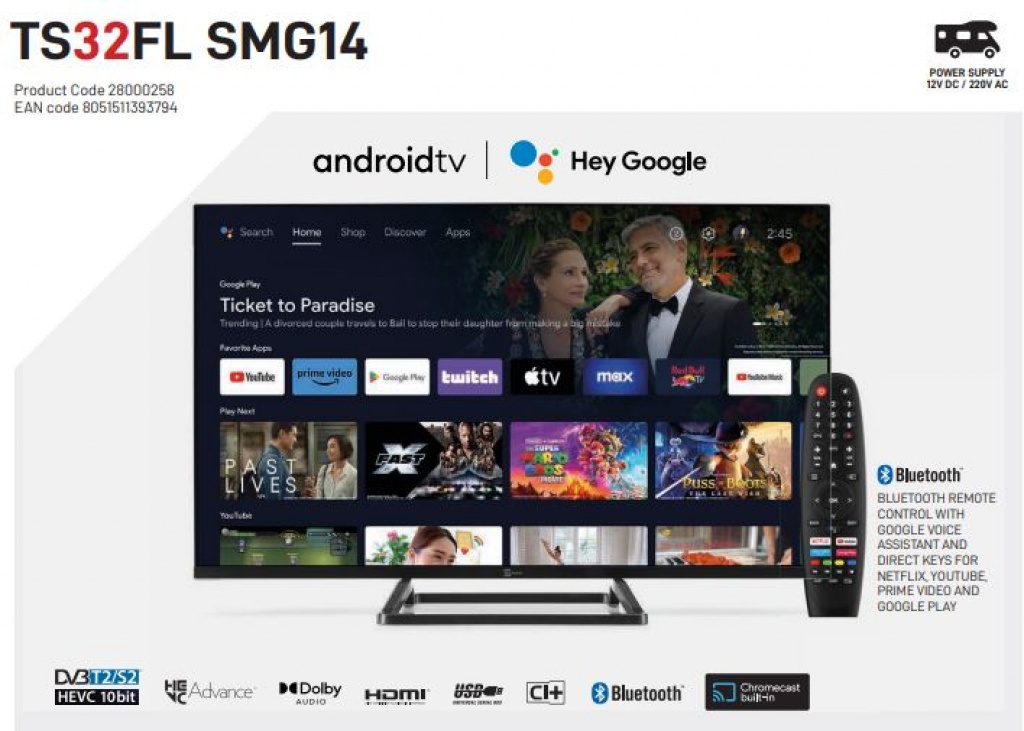 The TS32FLSMG14 can be used both at home or on holiday, thanks to its dual 220V AC power supply + 12V DC input (with a voltage surge protection system up to 24V) and is therefore also usable in your caravan, motorhome, truck or on board your boat. The TV is also very suitable for use in the bedroom, for example.